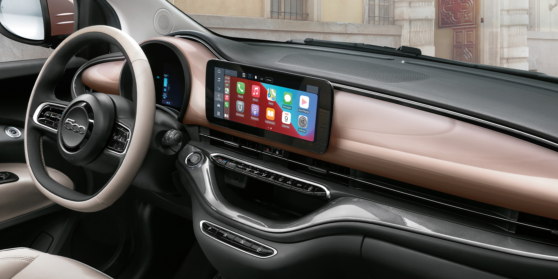 La Fiat 500e est compatible avec Apple CarPlay : connectez votre iPhone à l'écran Uconnect™ 10,25" et contrôlez Apple CarPlay sans fil avec la commande vocale Siri ou l'écran tactile. Apple CarPlay sans fil est le moyen le plus efficace et le plus sûr d'utiliser votre iPhone dans votre voiture. Vous pouvez obtenir des indications, passer des appels, envoyer et recevoir des messages et écouter Apple Music, des livres audio ou des podcasts tout en restant concentré sur la route.